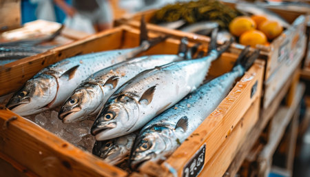 Freshly Caught Mackerel Abundantly Displayed on Ice in a Wooden Crate at a Bustling Fish Market