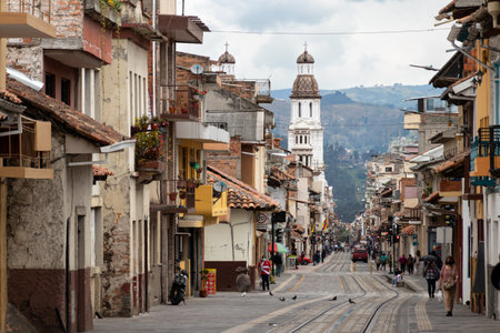 Cuenca, Ecuador - January 27, 2022: Historical center of city Cuenca, UNESCO heritage site. View at the street Gran Colombia and church Santo Domingo