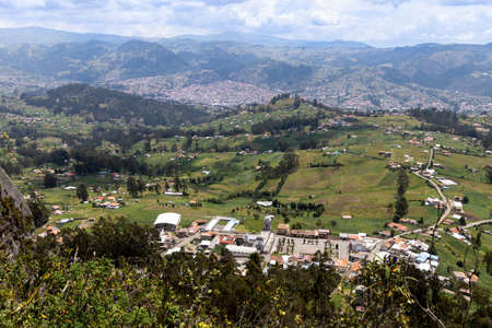 Airview at the small city Cojitambo and Azogues city from the top of the hill Cojitambo famous of its archeological site of Cañari culture and Incas ruins. Cañar province, Ecuador