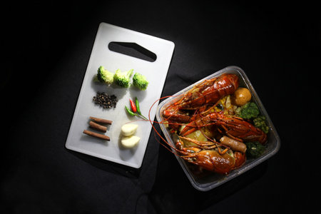 Cooked red crayfishes on black stone background. Red boiled crayfishes food. Shellfishes delicious lunch.