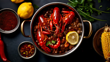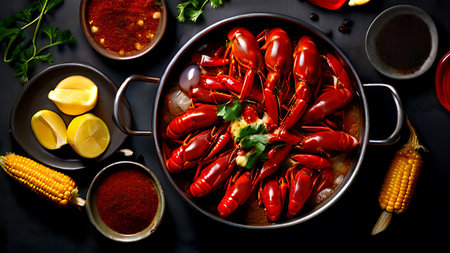 A mouth-watering crawfish boil featuring vibrant red crawfish, fresh lemons, corn on the cob, and an assortment of spices arranged on a dark background, perfect for a festive meal.