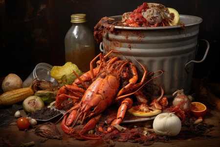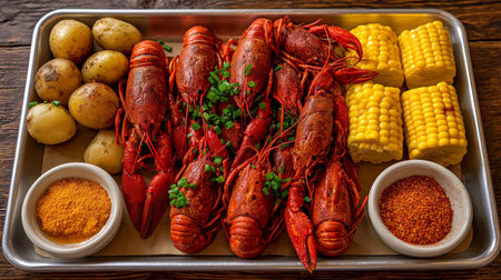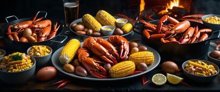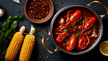 A mouthwatering seafood boil featuring fresh lobsters, corn on the cob, and an assortment of spices, all beautifully arranged on a dark background.