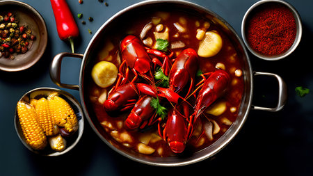 A mouthwatering seafood boil featuring crawfish, corn on the cob, and a spicy sauce, arranged in a large pot with additional spices and herbs on the side.