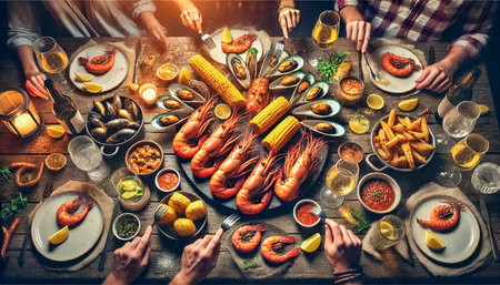 Passing around a bucket of fresh seafood, lobsters, crabs or shrimp, cracking legs and tails while telling laughing stories. Generative AI