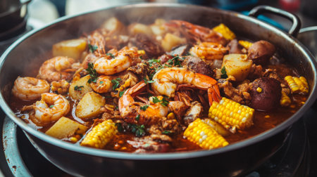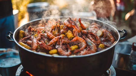 A delightful seafood boil served in a large pot, filled with shrimp, corn, and potatoes, with spices and herbs, evoking the warmth of a communal feast