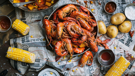 Delicious crawfish accompanied by corn and potatoes ready for enjoyment at a casual gathering