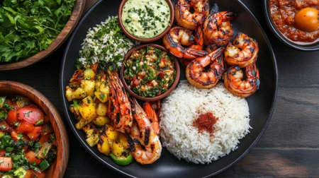 A top-down view of a beautifully arranged plate of grilled shrimp with various side dishes like rice and vegetables, highlighting a complete and delicious meal.