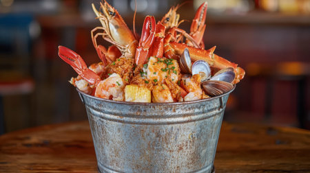 A rustic metal bucket brimming with freshly caught seafood, including shrimp, crab legs, and clams, set on a wooden table.