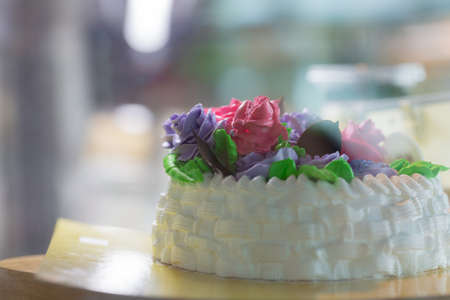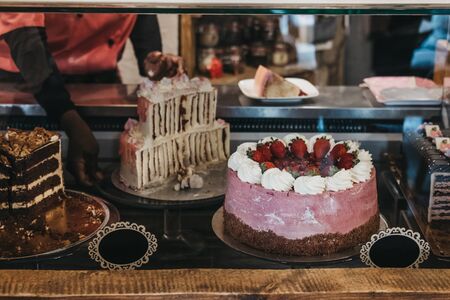 Cakes and desserts with on sale at a counter inside a cafe. Selective focus.