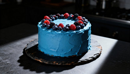 Blue frosted cake sits on a rustic slate plate under directional studio light with rich shadows and a ring of raspberries and blueberries on top. Dark tabletop and bright side area provide copyspace for text or design placements