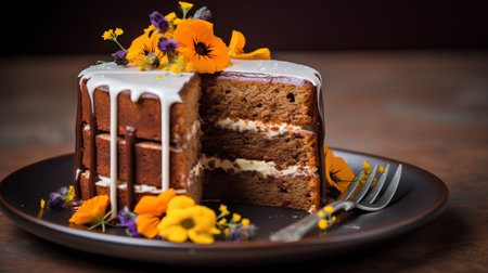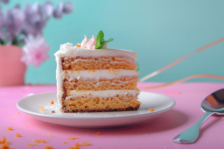 Delicious carrot cake slice with cream cheese frosting on a pastel background