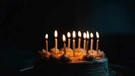 A birthday cake is illuminated by multiple lit candles. The visual displays a close-up shot of the decorated cake against a dark backdrop. The warm glow of the flames creates a celebratory atmosphere, suitable for various editorial and commercial applications. The composition highlights the cake's design.