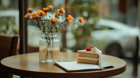 A beautifully presented slice of cake topped with fresh raspberries sits on a wooden table next to a vase of vibrant flowers, creating a warm cafe atmosphere.