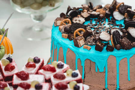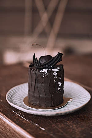 Chocolate cake in cocoa from above berries raspberries, black currant, biscuits, sweets on a round plate on the table. Cake slice, berries in macro. Birthday cake number 2. Top view, side view. Close-up