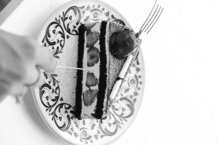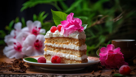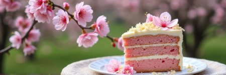Cherry blossom cake slice with cream frosting on white plate in garden setting. That the image is generated using AI.