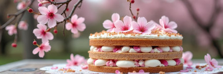 Cherry blossom cake with cream and petals in outdoor spring setting. That the image is generated using AI.