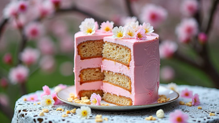 Pink spring cake with cherry blossoms on lace tablecloth outdoors. That the image is generated using AI.
