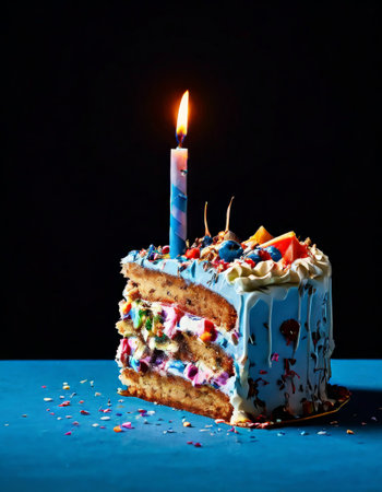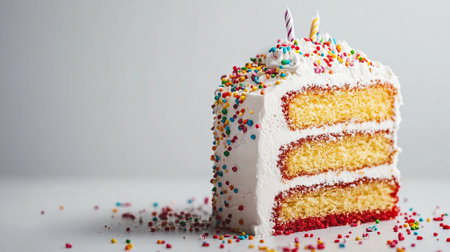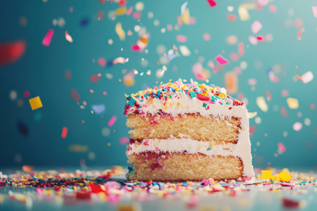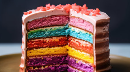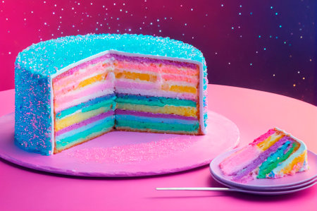 A vibrant slice of layered cake featuring bright colors and smooth frosting sits on a reflective surface, evoking joy and celebration. Perfect for parties!