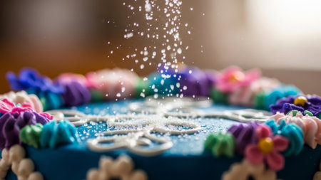 Close-up of blue cake with colorful flowers, sugar falling, kitchen