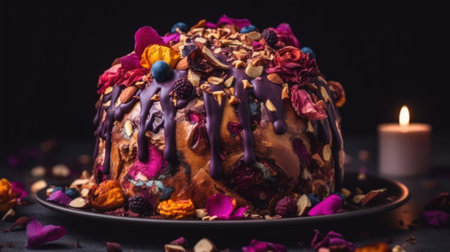 fruit cake with nuts and berries and sweet syrup in dark generative ai.