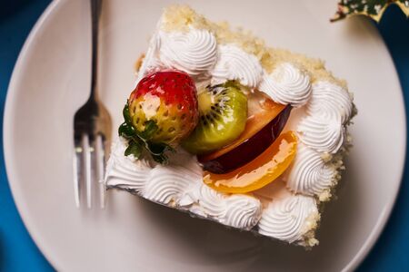 Piece of Fruit cake with strawberry, kiwi, peach, apple, custard cream and cup of tea on blue background with Christmas decorations, holly branch with berry, fir cone, flower cinnamon stick
