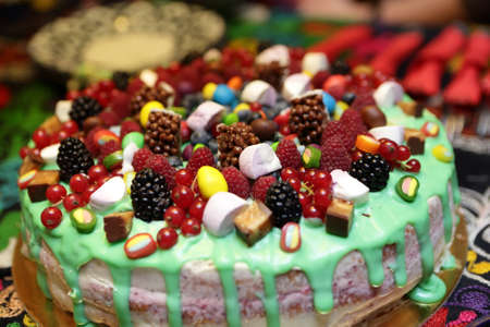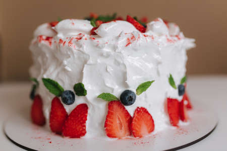 Delicious strawberry birthday cake on white table. Cake decorated with blueberry and mint. Vegetarian food. Lactose free and gluten free