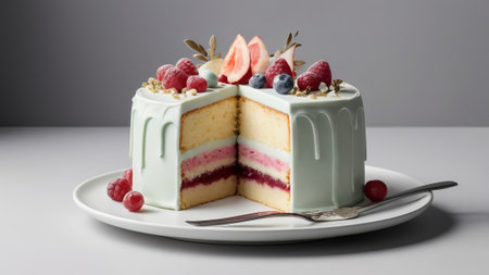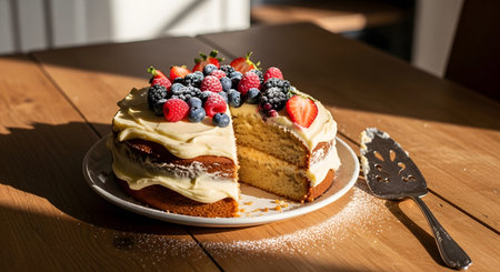 A delicious whole sponge cake topped with white frosting and fresh berries (strawberries, raspberries, blueberries) sits on a wooden table in sunlight. A slice has been removed, revealing the fluffy texture, making it perfect for a celebration or tea time.