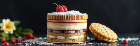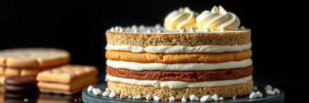 Delicious layered cake with cream frosting and decorative meringue on a dark background during a dessert preparation