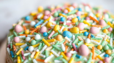 Colorful cake topped with vibrant sprinkles during a festive celebration in a cozy kitchen