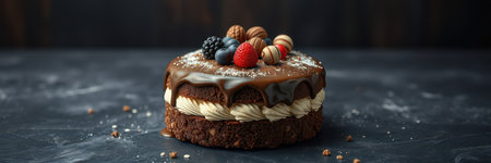 Indulgent chocolate cake topped with fresh berries and nuts on a dark surface