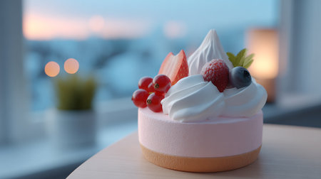 Delicious layered cake topped with fresh fruits at a cozy dessert setting