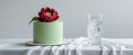 AI Generated. A green cake with a flower on top sits on a table next to a glass of ice water