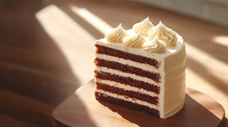 Delicious layered cake on a wooden surface, sunlight casting soft shadows, perfect for dessert or bakery promotions.