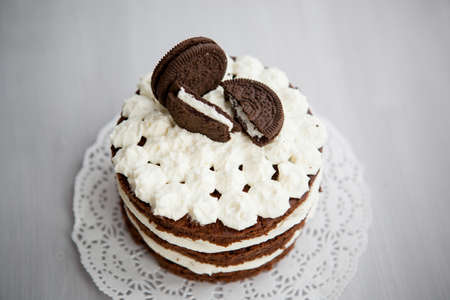 classic homemade cake with white chocolate cream cake decorated with biscuits on a light background