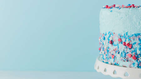 Blue Birthday Cake with colorful sprinkles over a light grey background.