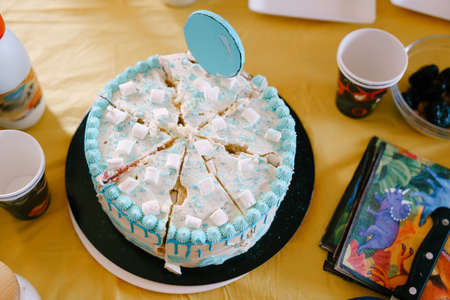 Pink and violet birthday cake without one piece. Dessert, holidays and delicious concept.