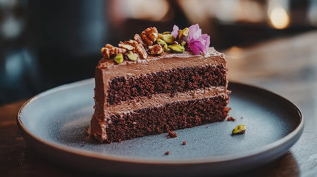 A close-up of a luxurious chocolate cake slice with a perfect balance of frosting, walnuts, and pistachios, beautifully arranged on a ceramic plate.