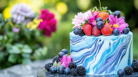 Blue marble birthday cake with a cosmos theme, adorned with fresh strawberries, blueberries, and blackberries.