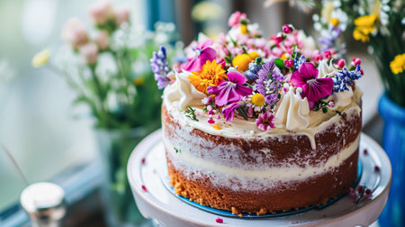 Colorful spring cake decorated with flowers and Easter eggs on a white stand