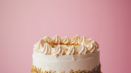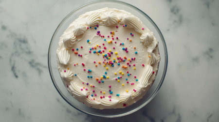 Detailed shot from above of a classic vanilla cake with a smooth frosting and a sprinkle of colorful confetti, highlighting its simple yet elegant decoration.