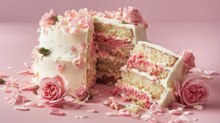 A beautifully crafted pastel cake with layers of moist sponge and pink frosting is garnished with delicate rose petals and green accents, creating an appealing dessert centerpiece.