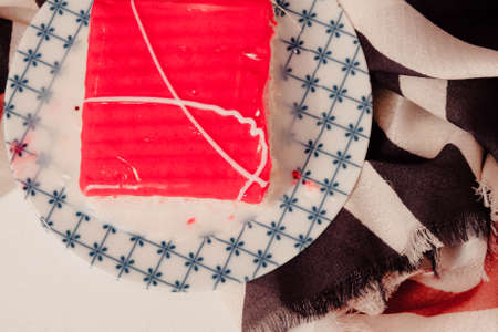 Cake mousse with sweet icing. Red cake with strawberry mousse.