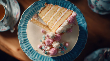 Elegant layer cake with a slice cut out, decorated with pink and blue buttercream flowers, served on a vintage blue pedestal plate for a formal tea party. Overhead view.