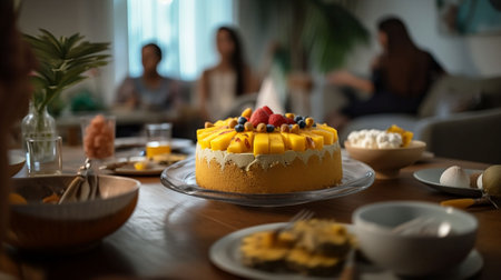 An AI generated illustration of a delicious fruit cake with toppings on the table