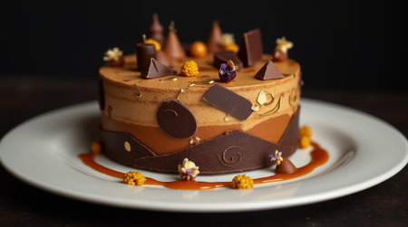A richly decorated chocolate cake features elegant floral touches and a drizzle of caramel sauce, set against a dark backdrop. Perfect for celebrations.
