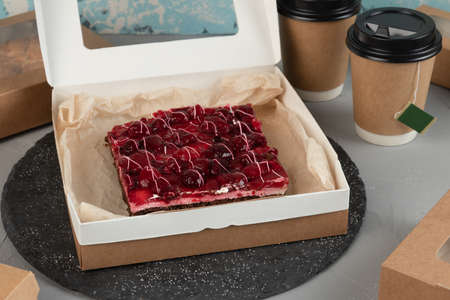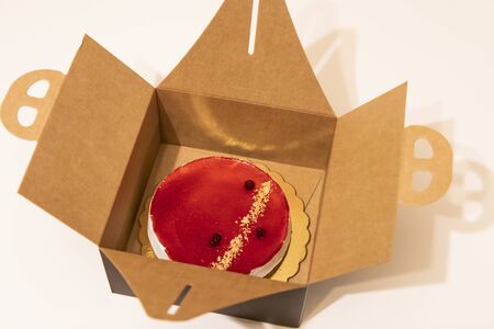unboxing a cheesecake from its packaging. Cheesecake with red jam with berries and raspberries. On a white table, brown box.