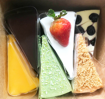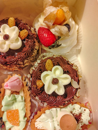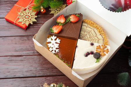 Set of different cakes in a craft box on brown wooden background