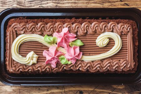 Chocolate rectangular cake decorated with cream roses. Sweet food is a confectionery business. Top view,