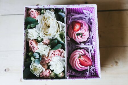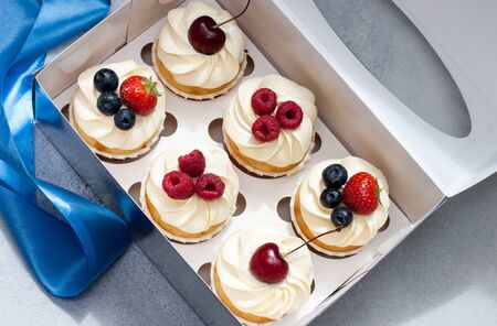 Cupcakes with whipped cream, fresh cherries, raspberries, blueberries, strawberries in gift box with blue ribbon. Selective focus.