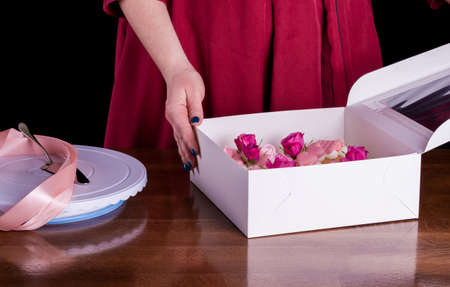 Close-up of female hands placing cupcake on table. Packaging of cupcakes